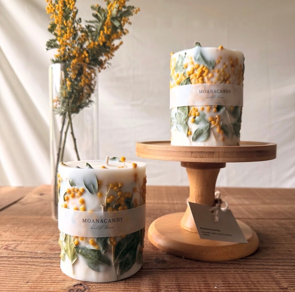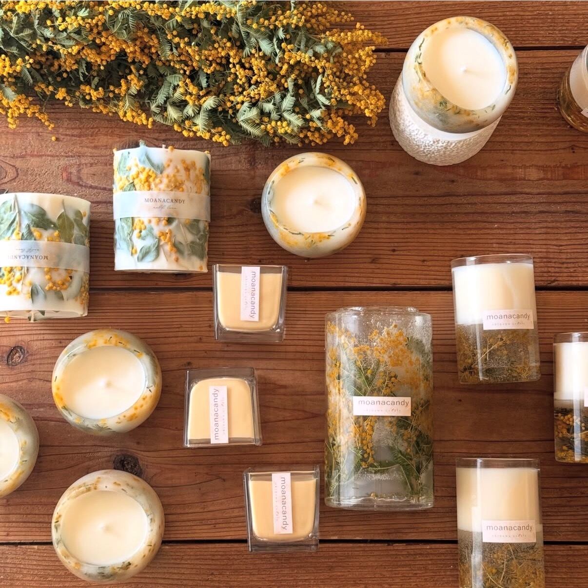 全面に色鮮やかなミモザのドライフラワーがあしらわれ、季節を楽しんで頂けるキャンドルです。